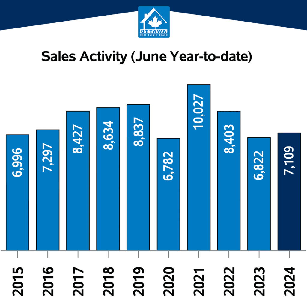 The number of homes sold through the MLS® System of the Ottawa Real Estate Board (OREB) totaled 1,439 units in June 2024. This was a marginal increase of 0.1% from June 2023. Home sales were 7.5% below the five-year average and 13.2% below the 10-year average for the month of June. On a year-to-date basis, home sales totaled 7,109 units over the first half of the year — an increase of 4.2% from the same period in 2023.